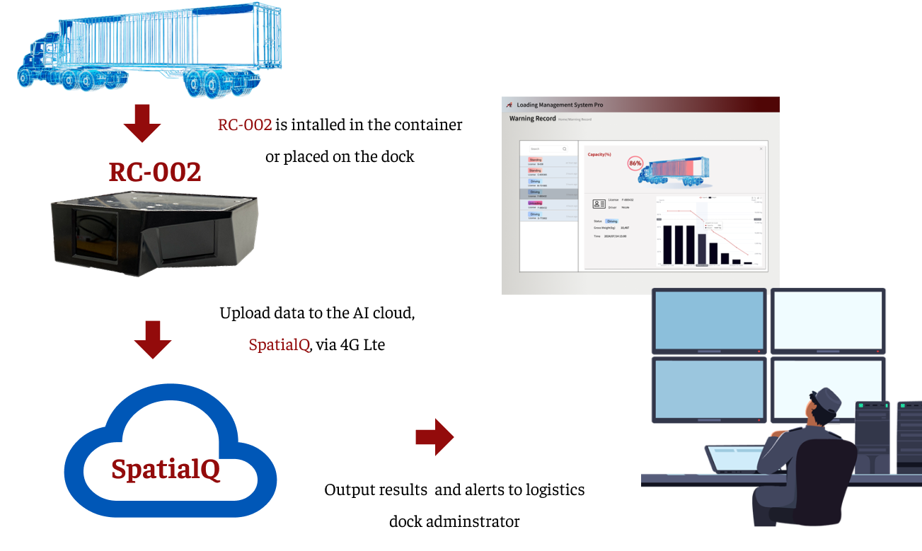 Combining long-range, a full-coverage ToF camera (RC-002) with an AI cloud platform(SpatialQ), this solution provides real-time monitoring of container volume changes, optimizes loading and unloading efficiency, and predicts progress.